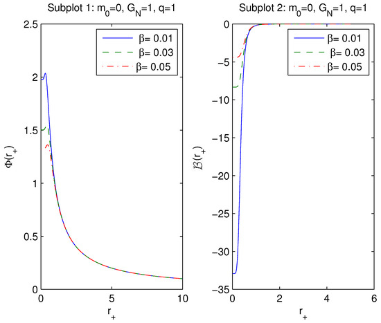 The left panel of Figure 2 shows that as , the goes to zero (), and is finite at . If the parameter increases, the magnetic potential decreases. In accordance with the right panel of Figure 2, the vacuum polarization is finite at , and becomes zero as (). If the coupling increases, also increases. By virtue of Equations (16), (19), and (21), we obtain the generalized Smarr relation