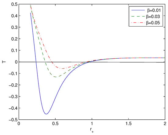 The functions T vs. at and . The solid curve is for , the dashed curve is for , and the dashed–dotted curve is for . In some range of , the Hawking temperature is negative where black holes do not exist. In the extremum of the Hawking temperature, phase transitions take place.