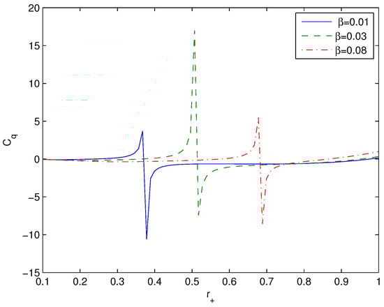 The heat capacity (23) is defined by Equations (19) and (24). In Figure 4, we depict the heat capacity (23) versus .