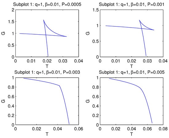 The critical ’swallowtail’ behavior with first-order phase transitions between small and large black holes is shown in subplots 1 and 2 for . In this case, one has the multi-valuedness of the Gibbs free energy, and it is continuous but not differentiable. Subplot 3 is for the case of the critical point with the second-order phase transition at ≈ 0.003. This case is similar to liquid–gas phase transitions. We have here a kink for the second-order phase transition. Subplot 4 corresponds to non-critical behavior of the Gibbs free energy for . For this case, there is a smooth behavior of the Gibbs free energy.