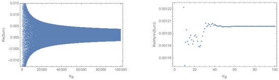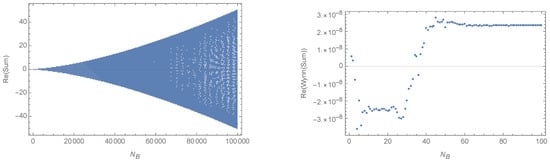 Figure 2. The plot on the left panel shows the partial sums over time-like areas for the computation of the expectation values. That is, compared with the sums shown in Figure 1, we insert a term proportional to n B 2 . As before, we sum over all positive values n B N B . The right panel shows Wynn’s epsilon algorithm applied to the series defined by the first 100 partial sums. This series shows quite a fast convergence. Note that the (anti-) limit is a very small number, which we found is typical for the computation of the expectation values in the ball model. The maximal relative error (defined in (20)) is of the order of 10 8 .