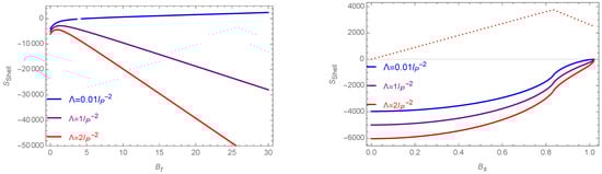Figure 3. The left and right panel show the action (in units of P 2 ) as a function of the time-like bulk area B t (left panel) and of the space-like bulk area B s (right panel); both areas are given in terms of P 2 . Different colors for the graph encode different values for the cosmological constant. We fixed as values for the boundary areas A 1 = 5 P 2 and A 2 = 7.5 P 2 . For space-like areas, the action has a real part (solid lines) and an imaginary part (dashed line). This imaginary part does not depend on the cosmological constant and is therefore the same for all shown cases. The case with Λ = 0.01 P 2 (in blue) does not have a Lorentzian critical point, but it has a Euclidean one. We will discuss examples with Euclidean critical points in the next section.