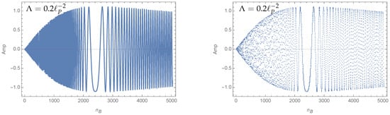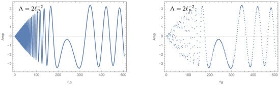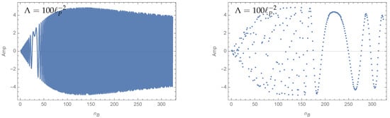 Figure 4. These plots show the amplitude (including the measure term) as a function of the (time-like) summation parameter n B for the example with Λ = 0.2 P 2 . (That is, B t = P 2 n B / n e with n e = 720 .) On the left panel, we use a continuous plot; on the right panel, we show only the amplitude values for the discrete values of n B , which we sum over. Note that if we would have used a spectrum B t = P 2 n B , the 5040 = 7 n e points shown on the right panel would reduce to just 7 points.