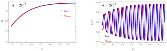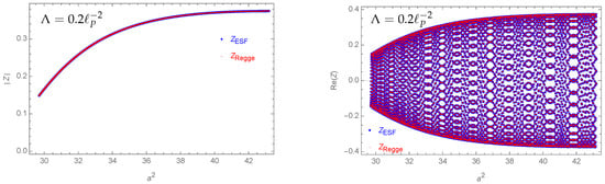 Figure 13. The left panel shows the absolute value of the spin foam sum and of the Regge path integral for the third example where Λ = 100 P 2 . The right panel shows the real parts. We now do see (small) differences between spin foam sum and Regge integral for both the absolute value and the real part. Here, we again plot the partition functions for every spectral value in the shown range for the outer boundary area.