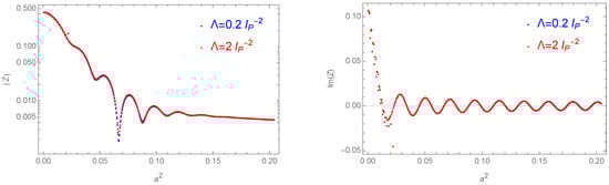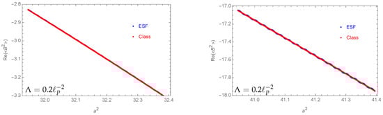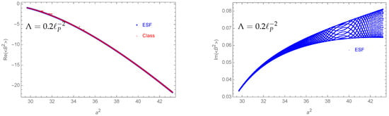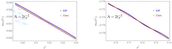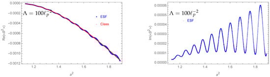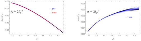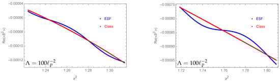 Figure 7. Here, we zoom into a smaller region of the plot shown on the left panel in Figure 6. The left panel shows the expectation value for smaller values of the scale factor squares for the outer boundary a 2 2 (or smaller differences ( a 2 a 1 ) 2 ) and the right panel for larger differences. In the latter case, we do observe very small oscillations of the expectation value around the classical value.