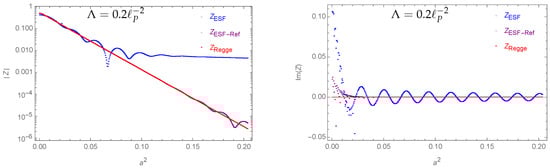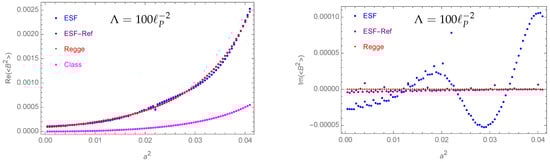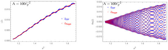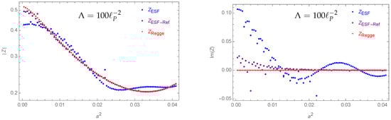 Figure 22. Here, we consider a very large cosmological constant Λ = 100 P 2 and compare the absolute value (left panel, logarithmic plot) and imaginary part (right panel) of the partition function for effective spin foams, effective spin foams with refined spectrum, and the Regge integral. We show the entire range of the boundary scale factor squared, for which the classical equations of motions for the discrete model emulate the continuum behavior. This range scales with the inverse of Λ , and is therefore very small, including only 90 eigenvalues for the boundary area. We observe that, over this small range, the differences for the various versions of the partition function are small.