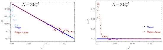 Figure 16. Here, we compare the absolute value (left panel, with a logarithmic plot) and imaginary part (right panel) of the Regge integral for two different choices: For Z Regge , we integrate over both the hinge regular and irregular configurations; for Z Regge Causal , we only integrate over the hinge regular configurations. Including the irregular configurations into the integral leads to a continued exponential decay of the partition function, which is also real. These two features are shared with the path integral for the continuum mini-superspace model.