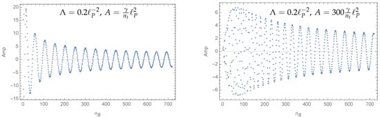 Figure 17. Here, we show the amplitude for a smaller value (left panel) and a larger value (right panel) of the boundary area A as a function of the discrete (time-like) summation variable n B . We see that, for larger boundary areas (equivalent to having larger differences between the outer and inner boundary, as the area for the inner boundary is vanishing), the discretization does not fully capture the oscillations of the amplitude over a larger range of the summation variable n B . One can therefore expect that the difference between Regge integral and spin foam sum is larger for larger outer areas.