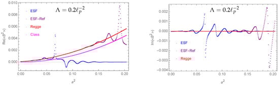 Figure 20. The left panel and right panel show the real and imaginary parts of the expectation value for the bulk area squared, respectively. We observe that the Regge expectation value already deviates from the critical value of the Euclidean classical action, with the difference increasing with larger scale factors. The effective spin foam expectation value starts to deviate from the Regge expectation value, starting with quite small scale factors. A refinement of the spectrum for the bulk area increases the regime where Regge and (refined) spin foam expectation values coincide.