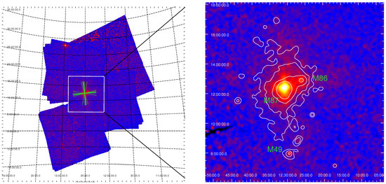 Figure 1. (Left) The exposure-corrected mosaic image of the Virgo Cluster observed by LEIA in the 0.5–4.5 keV band with an exposure time of ∼17.8 ks at the center position. Green crosses indicate the direction of each observation. (Right) The image in the right panel is an enlarged view of the white box ( 12 × 12 ) in the image on the left, which overlaps the contour of ROSAT PSPC image of the Virgo Cluster in the 0.5–2.0 keV band. The contour lines represent being 3 σ , 5 σ , 11 σ , and 25 σ above the background [19].