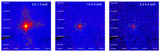 As the ROSAT PSPC observations only offer an energy band that extends from 0.1 to 2.4 keV, LEIA’s wide-field X-ray imaging up to 4.5 keV provides us with an opportunity to see the features of the Virgo Cluster. In order to better reveal the radiation distribution of the Virgo Cluster, Figure 2 presents a LEIA image of the source in the emission ranges of 0.5–1.5 keV, 1.5–2.4 keV, and 2.4–4.5 keV from the central 6 point. For comparison, we also provide a contour in each panel which shows 5 σ levels above the background noise for the images in the 0.5–1.5 keV range and 3 σ levels for the images in the 1.5–2.4 keV and 2.4–4.5 keV bands. In the 0.5–1.5 keV band, the diffuse arm structure around M87 is clearly visible. The scale of arm extension to each edge is up to 5; above the 1.5 keV band, the thermal gas radiation is barely visible, overshadowed by the central point source and the influence of its PSF. This is the first time a lobster-eye focusing telescope has been used to see a large-scale image of the Virgo Cluster that shows that diffuse thermal emission exists around M87 in the 0.5–4.5 keV band.