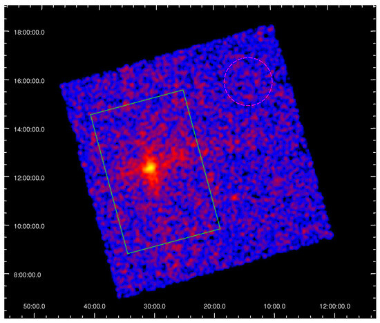 Figure 3. X-ray image of the Virgo Cluster obtained by LEIA during a one-shot observation of 1083 s in 0.5–4.5 keV. The solid-lined green box is the source region of the Virgo Cluster. The magenta circle formed with a dashed line is the background region.