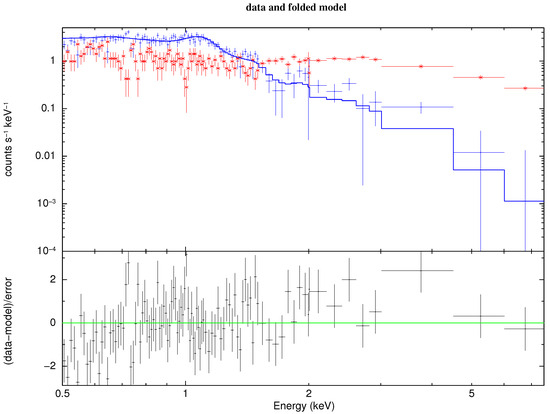 We used XSPEC (version 12.11.1) to model the spectrum. Most regions of the Virgo Cluster can be well fitted by a single temperature model [28], while the central region (<2 arcmin) may be affected by non-thermal radiation [29,30]. The LEIA spectrum can be characterized by an absorbed APEC model, allowing the model and the spectrum to be fit together with the WABS*APEC fitting model. The hydrogen column density was fixed as 2.13 × 10 20 cm 2 [22,31]. The redshift was fixed to 0.00428. Due to the inability to determine the metal abundance effectively from the spectra, we set the abundance ratio to 0.3 Z . The fitting results are listed in Table 1 and shown in Figure 4. The blue and red data points are from the source and background components, respectively. The energy spectrum above 1.6 keV is dominated by the background caused by the aperture and non-aperture cosmic X-ray background (CXB), as well as the particle-induced background [32]. The reduced chi-squares of ∼1.24 show that our model is reasonable. The temperature of the model fitting is 2 . 1 0.1 + 0.3 keV, which is consistent with the overall temperature ( 2 . 4 0.2 + 0.3 keV) within the 1 radius of M87 measured by ROSAT [19] and the average temperature of ∼2.3 keV [22] derived by Arnaud et al. [33] obtained from XMM-Newton.