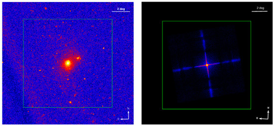Figure 5. (Left) ROSAT PSPC image of the Virgo Cluster in the 0.5–2.0 keV band. The center of the green box ( 10 × 10 ) is the location of the cluster’s central AGN, M87. (Right) The X-ray image of Sco X-1 captured by LEIA that is regarded as the ideal PSF image of the observed source.