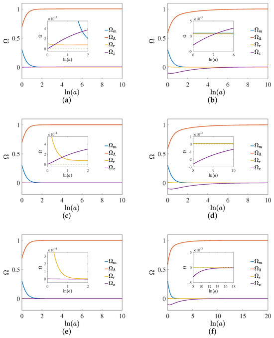 Cosmological evolution of the model with varying initial conditions at . (a) , ; (b), ; (c), ; (d), ; (e), ; (f), .