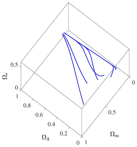 Point is always physically accepted and corresponds to a radiation-dominated universe. The eigenvalues for this point are . It is unstable, as point admits two positive eigenvalues at least.