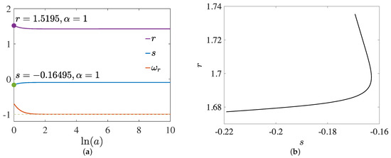 The trajectories of different cosmological models present different qualitative behaviours in the r–s plane, thus the diagnostic pair is conducive to segregate different DE models. The parameter pair (, ) corresponds to the standard cold dark matter (SCDM) model while (, ) is related to the cold dark matter (CDM) model. The trajectories of quintessence and Chaplygin gas model lie in the regions and and and , respectively [71,72]. In the terms of variables (13), the diagnostic parameters r and s can be written as