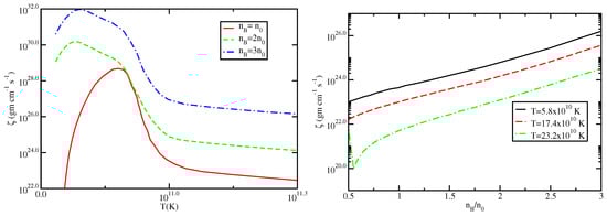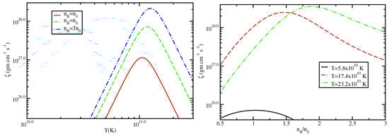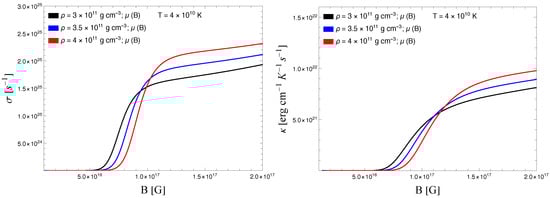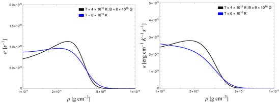 In this section, we present the plots for the quantized longitudinal electronic transport coefficients in dense and hot magnetized QED plasma, pertinent to BNS merger simulations. The analysis accounts for electron–ion scattering through screened electromagnetic interaction in plasma. Plots illustrating the variation in transport coefficients with density, temperature, and magnetic field are presented for Fe. The plotted scales adhere to conditions of relativistic electrons at densities g cm−3, and temperatures K. The specified density and temperature, combined with a magnetic field of approximately G, meet the criteria for the zeroth Landau level population, as dictated by the equation . These constraints validate the high magnetic field and low-density regime of BNS mergers as the physical domain for our calculations.