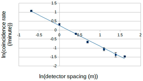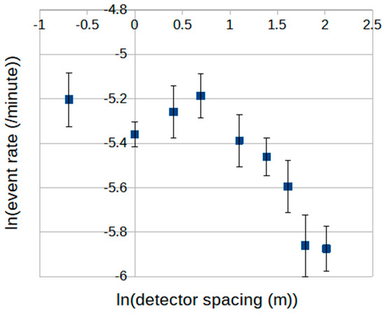 Riggi et al. displayed their data in linear graphs of coincidence rate vs. spacing. Their data can be read and translated to a ln-ln power-law format, and it can be seen to be adequately fitted by a falling power law with an index ~−0.8. Figure 2 shows a similarly plotted ln-ln relationship determined using the Adelaide 0.25 m2 scintillators (each triggered slightly below the one-particle level). Again, a power law is an adequate fit to the data, in this case with a power-law index of about −1.15. These results are also consistent in the values of their indices with modelling using a toy model, described below, such that the use of larger detectors (sensitive to smaller particle densities (per square metre)) results in a steeper power law relating to coincidence rate and detector separation.