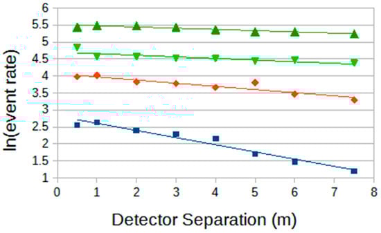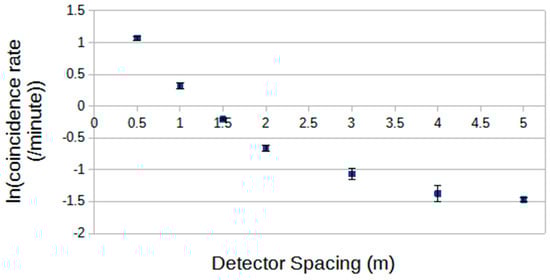 An alternative procedure is to require that the recording of the two detector signals also requires an explicit local air-shower trigger. In this way, an extra constraint is added, and the experiment is closer to studying broader underlying shower characteristics. In the earlier arrangement, all showers are accepted which trigger both detectors. Now, there is a selection of component showers from that group of two-detector triggers. The shower-size trigger may be at a low level (small air showers), but its inclusion reduces the event rate as the very small showers are preferentially excluded and a shower size baseline is set. There is then an opportunity to investigate the relationships between particle densities for detectors at small spacings within air-shower detection systems. For such an arrangement, at least at small core distances, the relationship between the ‘two-detector coincidence plus array’ trigger rate and detector separation can be expressed as an exponential, and a characteristic scale length can be defined. This scale length is shortest for measurements close to the shower core where the lateral distribution is most steep, as exhibited by it increasing with the shower size threshold (Figure 6) for a fixed detector particle density (larger shower sizes enable the two-detector coincidence to occur further from the shower core) and decreasing with increasing particle density for a fixed shower size threshold (Figure 8), when the triggered detectors must be closer to the core. Thus, one finds that there is a measurable scale length which is small, close to the shower core (below the lowest 7 m length shown in Figure 8) and this is closely related to physical scales in the core region of the shower. There is very little information in the literature related to this core distance range for small sea-level showers. Morales-Soto [6] shows high altitude data and modelling from the HAWC experiment which shows some low-energy proton primary lateral-distribution data. Those limited data are compatible with an exponential scale of order 8 m at core distances below 10 m. Georgios [7] has modelled sea-level proton lateral distributions at rather higher energies with a scale at small core distances of order 6 m. Those data seem to be compatible with the data presented here.