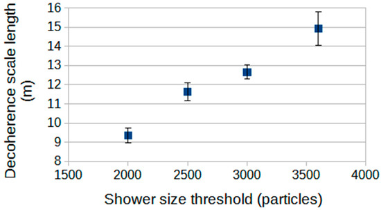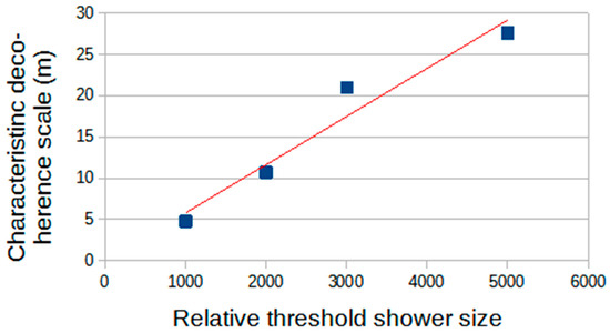 The (exponential) scale lengths for the toy-model decoherence curves in Figure 9 as a function of the shower size threshold. A simple linear fit is shown in red.