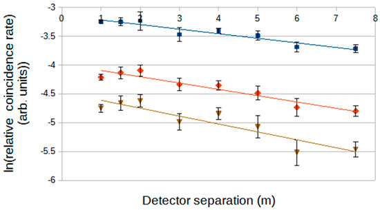 Decoherence curve for two 0.25 m2 scintillation detectors (coincidence rate versus separation) expressed as a power law.