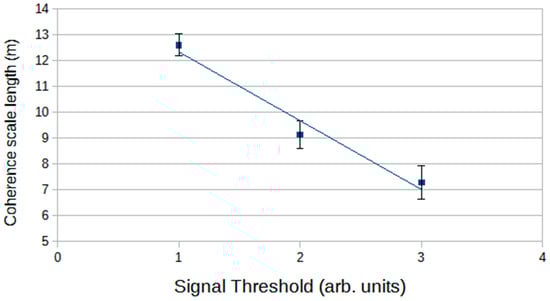 The (exponential) scale lengths for the decoherence curves in Figure 7 as a function of detector signal thresholds. (Arbitrary units are approximately particles.)