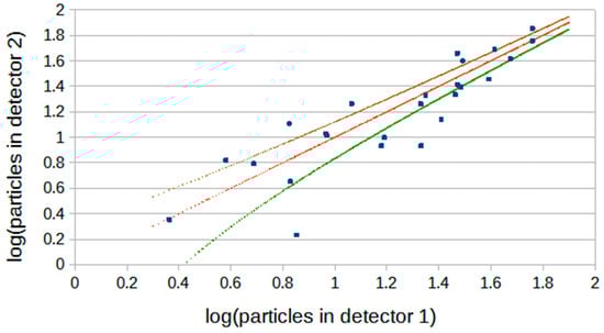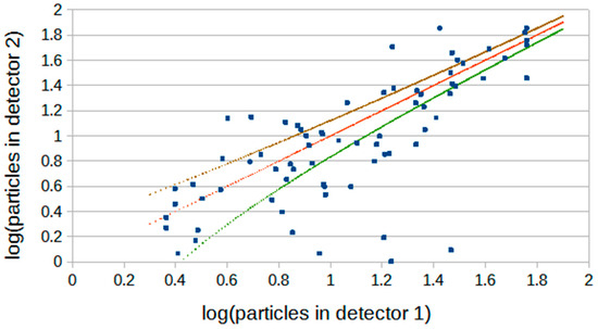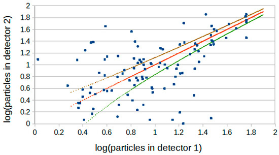 Particle numbers (log10 displayed) measured in two decoherence detectors located close together, when in coincidence with a recorded Roof Array trigger. The line of red points shows the 1:1 relationship and the brown and green points give that value +/− its square root. The latter would be the expected range for one Poisson standard deviation. The Roof Array particle-size parameter threshold was ~1500 particles.