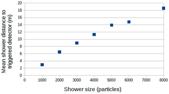 As the shower size is increased, the mean distance of the triggered detectors from the shower core increases. Figure 14 illustrates how the distance to the core of triggered showers increases with shower size for the toy model described above. It appears, then, that for the events which require a higher shower size trigger, the density fluctuations between the detectors are associated with regions of the shower which are progressively further from the steep shower core and where the fractional variation of the lateral distribution function over the detector dimensions progressively reduces. The fluctuations are then closer to random counting fluctuations rather than including a large component, due to the distribution of particle density changing with core distance.