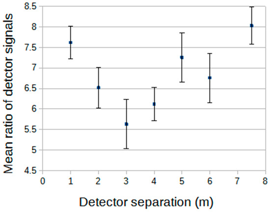 The spread in signal amplitudes between the two (non-zero signal) detectors varies when their separation is now changed from the previous arrangement when they were co-located. Figure 15 shows this variation for the triggering situation used for Figure 11. Here, with no shower size cuts, there is a low shower size threshold (1500 particles). Figure 11, for close detectors, shows significant outliers and, for display in Figure 15, the mean ratio of the detector signals is determined (larger/smaller signal), including the outliers. This is repeated in Figure 15 for increasing detector spacings.
