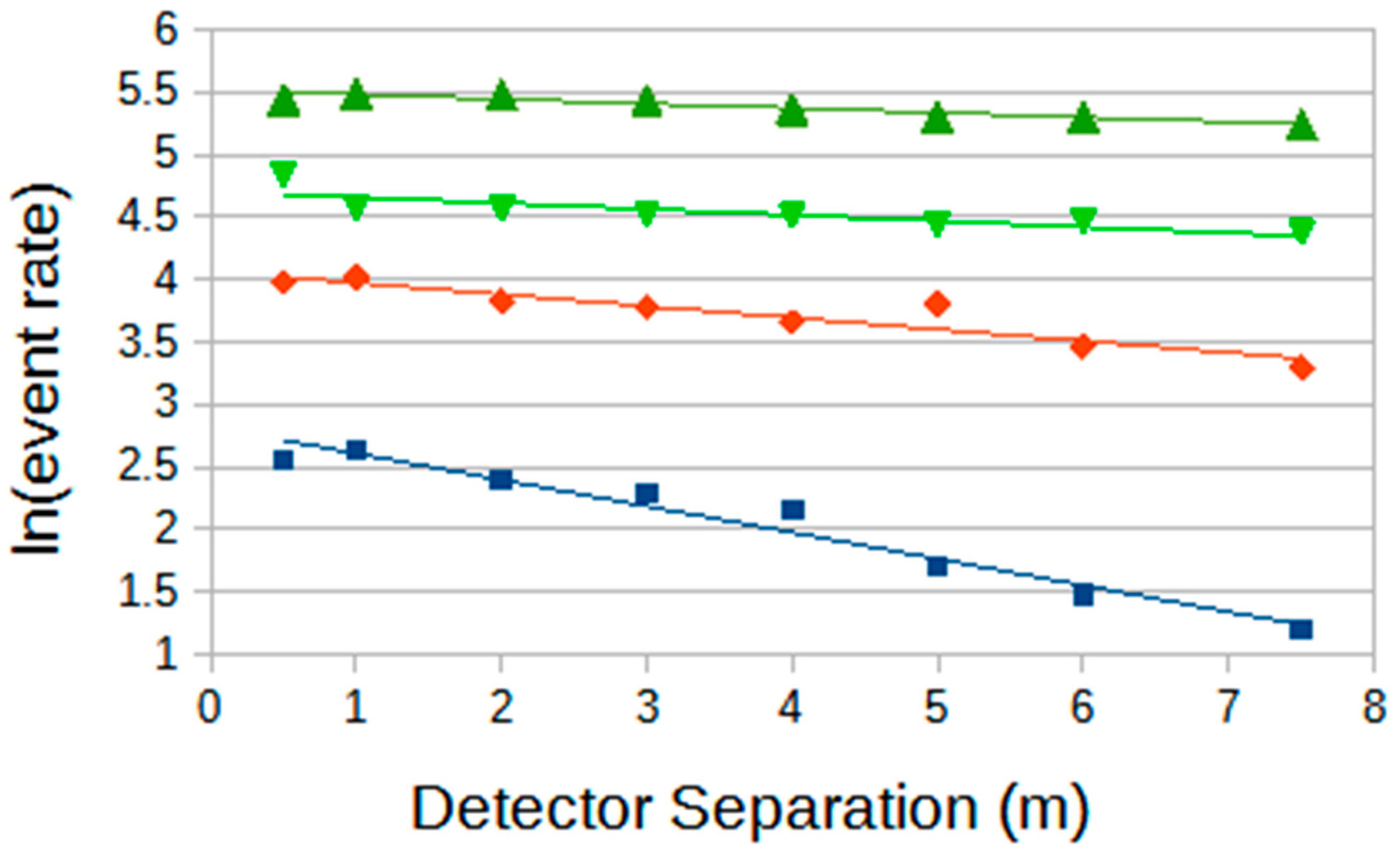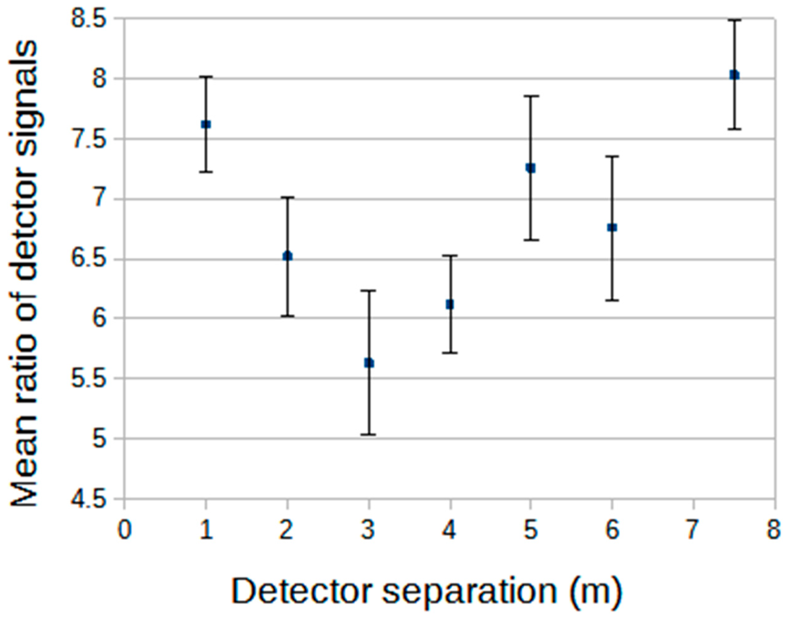 3.5. Spread in the Signal Amplitudes as a Function of Detector Spacing