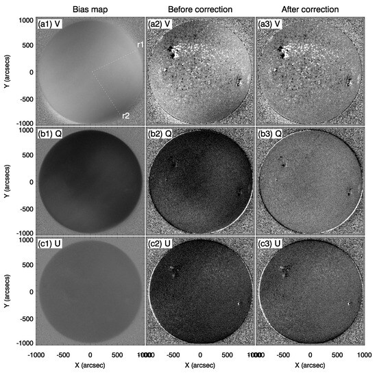 Correction for intensity to circular and linear polarization crosstalks. (a1–c1) Full-disk maps showing crosstalks intensity (I) to Stokes V, Q, and U. (a2–c2) The original Stokes V, Q, and U images. (a3–c3) The corrected Stokes V, Q, and U images.