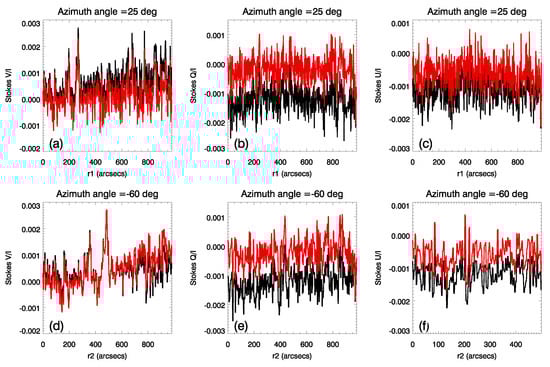 The variation of the raw and corrected Stokes V, Q, and U parameters along radial directions, at azimuth angles of 25° (a–c) and −60° (d–f). The black curves represent the data before correction, while the red curves represent the data after correction.