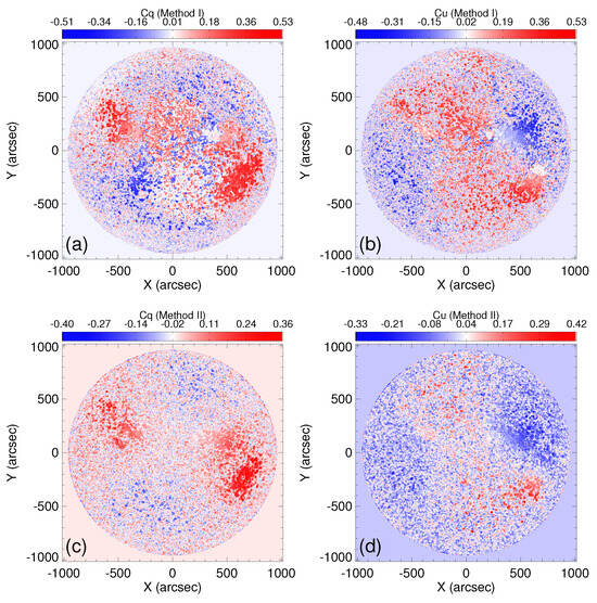 We would like to to introduce an alternative correction method, designated as Method II [27], that capitalizes on the linear independence exhibited among the Stokes Q, U, and V signals. This independence can be observed either in their spatial intensity distribution at a specific wavelength position of the working line or in their polarized spectral profiles. Once a correlation emerges among the Stokes Q, U, and V signals, it can be considered as a result of crosstalk from the V signal to the Q and U signals. The correction method involves finding the values of and from a series of assigned values that minimize the correlation between V and Q, U. In this way, we can consider that we have found the correct and as shown in panels (c) and (d) of Figure 3. The maps of and obtained from both methods are similar in distribution, but the data obtained from Method II are slightly smaller. Panels (c) and (f) in Figure 4 show the corrected data of the Stokes Q and U full-disk maps. The error analysis [27] indicates that the impact of the line-of-sight Doppler velocity on the crosstalk coefficients obtained from Method II is not significant, resulting in an error of no more than when km . When the crosstalk exceeds , the calculated coefficients are very close to the actual crosstalk coefficients. However, when the crosstalk is less than , the deviation between the calculated coefficients and the actual coefficients exceeds . The smaller the crosstalk is, the larger the calculated coefficient error becomes.