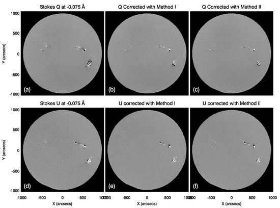 Correction of full-disk Stokes V to Q and U images. (a,d) The raw Stokes Q and U data. (b,e) The corrected Stokes Q and U images using Method I. (c,f) The corrected Stokes Q and U images obtained through Method II.