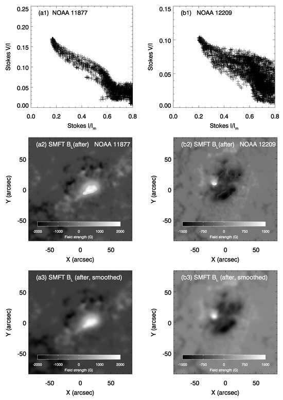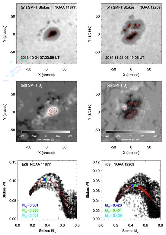 Filter-type magnetographs observe circular polarization at a single wavelength and calibrate the line-of-sight (LOS) magnetic field from images of Stokes V under the assumption of a weak magnetic field, where the relationship between LOS field strength and the Stokes parameter V/I is approximately linear. Figure 5(a1,a2) show the Stokes I map and LOS magnetogram of NOAA 11877 observed by SMFT on 24 October 2013. It was composed of a single sunspot. We can see that the magnetic field decreased in the sunspot umbra (inside the red contour) which may be caused by the weak-field approximation calibration adopted by SMFT. Figure 5(a3) displays the relationships. represents the maximum value of Stokes I for the whole intensity image of an active region, which varies with the active region. The relationship is not linear. A similar phenomenon was also found for NOAA 12209, observed by SMFT on 21 November 2014, which was composed of multiple sunspots (Figure 5(b1–b3)). To solve this phenomenon, Xu et al. [30] developed a method based on the correlation between the Stokes and observed by SMFT. They used the second-order polynomial to fit the scatter plot of Stokes . We applied the same method for NOAA 11877 and 12209. From Figure 5(a3,b3), we can see that the second-order polynomial (red line) has a good fit when > 0.02 and ≤ 0.70. The corresponding to the apex (green asterisk, hereafter denoted as ) is 0.380 for NOAA 11877 and is 0.451 for NOAA 12209. For NOAA 11877, and have a negative correlation for the area , and a positive correlation for the area which is inside the red contour in Figure 5(a2). For NOAA 12209, and have a negative correlation for the area , and a positive correlation for the area which is inside the red contour in Figure 5(b2).