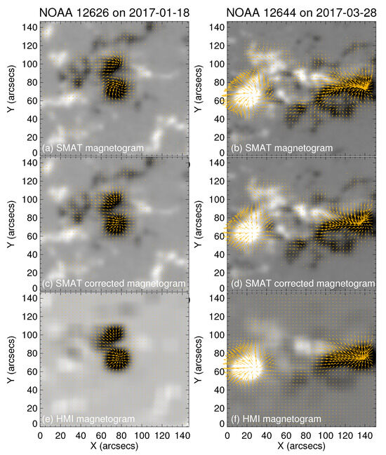 Removal of Faraday rotation in the transverse field. (a,b) Depiction of the raw vector magnetograms with Faraday rotation, captured by SMAT on 18 January 2017, and 28 March 2017, respectively. (c,d) The corrected vector magnetograms after accounting for Faraday rotation. (e,f) The vector magnetograms captured by HMI on 18 January 2017, and 28 March 2017, respectively.