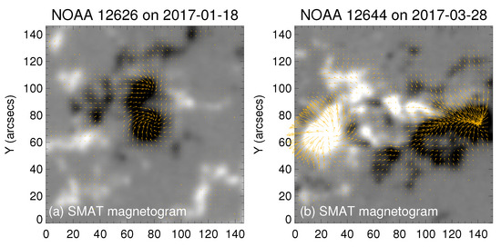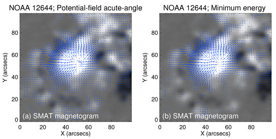 SMAT cutout vector magnetograms, displaying a segment of active region 12644, captured on 28 March 2017. (a) Implementation of the potential method for resolving the 180-degree ambiguity in the transverse magnetic field. (b) Employment of the minimum energy method to address the 180-degree ambiguity in the transverse magnetic field.
