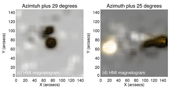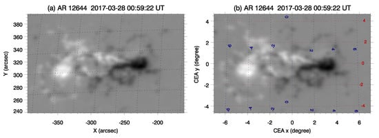 - Gary, G.A.; Hagyard, M.J. Transformation of vector magnetograms and the problems associated with the effects of perspective and the azimuthal ambiguity. Sol. Phys. 1990, 126, 21–36. [Google Scholar] [CrossRef]