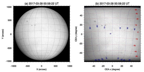 The projection correction process for solar magnetograms comprises two main steps: remapping and vector transformation. First, remapping involves converting the 2D observational coordinates into 3D spherical coordinates. This step is crucial to accurately represent the solar surface in its natural spherical geometry. To minimize distortion, especially towards the poles, our full-disk magnetographs initially employ a cylindrical equal-area (CEA) projection, as introduced by Calabretta and Greisen (2002) [41] and Sun (2013) [42]. The CEA projection allows for a more uniform representation of the solar surface by mapping it onto a cylinder. After the CEA projection, the heliographic coordinates () are then converted to CCD coordinates (), which are used by the imaging sensors. Figure 10 and Figure 11 show two examples of the remapping process applied to the filtergrams captured by SMAT taken on 28 March 2017. It is noticeable that the remapping is undistorted along the equator but that distortion increases progressively towards the poles.