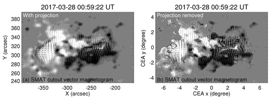 Vector magnetogram of active region 12664, extracted from the full-disk vector magnetograms captured by SMAT at the blue spectral wing of −0.075 Å in the FeI 5324.185 Å spectral line on 28 March 2017. (a) The original (observed) vector magnetogram, and (b) the magnetogram deprojected to the local Cartesian (or spherical) coordinate system.