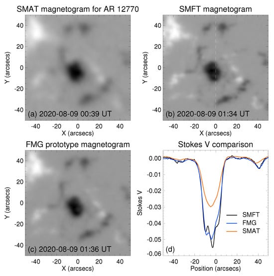 We aim to identify an active region 12770 that has been observed by all three instruments (SMAT, SMFT, and FMG), as shown in Figure 13. We then intend to conduct a comparative analysis of the Stokes V signals in the umbra center region, focusing on potential variations that may indicate the presence of magnetic saturation mechanisms. In the umbra center, panel (d) reveals that the V signal observed by SMAT hardly shows any sign of weakening, while the V signal observed by FMG exhibits a decrease of approximately (with a concave upward curve). However, the V signal observed by SMFT experiences the most significant weakening, decreasing by approximately . This suggests that the weakening of the magnetic field signal at the umbra center is not only related to the working spectral line itself, but also to the instrument or the environment where the instrument is located. According to Su et al. [44], the scattered light caused by the instrument itself can affect the intensity of the umbra center signal of the sunspot, and generally, the stronger the scattered light is, the weaker the umbra magnetic field signal will be. Therefore, we believe that the weakened penumbra signal observed by the Huairou Solar Magnetic Field Telescopes may be the result of the combined effect of magnetic saturation and instrument stray light. The weakening of the penumbra signal caused by a single magnetic saturation may not be severe.