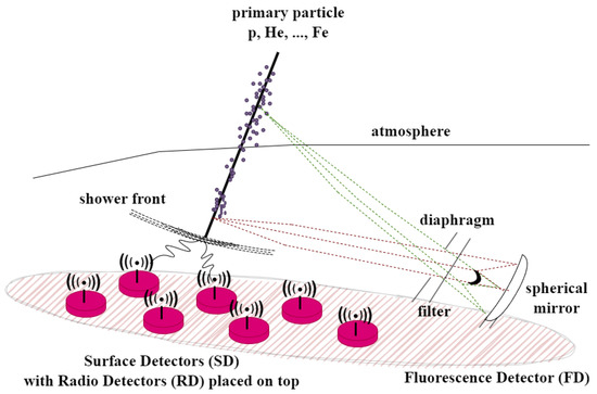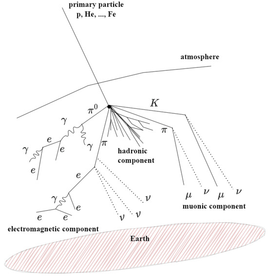 Indirect measurements are preferred for UHECRs. They are conducted by measuring not the primary particle itself but the secondary particles produced in an extensive cascade, following the initial collision of the cosmic ray with air molecules in the atmosphere. This process is known as an extensive air shower (EAS) (Figure 2), which consists of hadronic, muonic, and electromagnetic components. The electromagnetic component, composed of electrons, positrons, and photons, carries about 90% of the primary particle’s energy [15], making it the most valuable component for energy measurements. The remaining 10% is carried by muons and neutrinos.