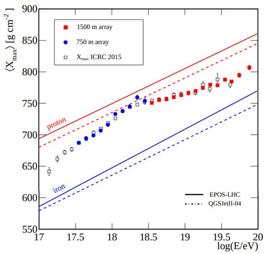 The footprint of the EAS provides valuable information about the cosmic ray, including its energy, arrival direction, core position on the ground, and the shower maximum (). The reconstruction of , i.e., the depth in the atmosphere at which the energy deposition in the shower is greatest, is essential for determining the mass compositions of the cosmic rays (Figure 3). These measurements can be compared with prediction from air shower simulations for the two extremes of primary particle types (proton and iron nuclei) for different hadronic interaction models.