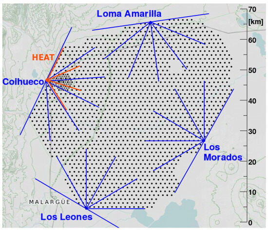 The Pierre Auger Observatory [18] is the world’s largest cosmic ray experiment, operating in the western Mendoza province, Argentina since 2004. Its main goal is to understand the origin and nature of UHECRs [19]. The observatory is unique, in that it combines complementary detection techniques (Figure 4); 27 fluorescence telescopes capture the ultraviolet light emitted by excited nitrogen molecules in the atmosphere; 1660 water Cherenkov detectors, which are ground-based tanks filled with purified water overlooked by three photo-multipliers that detect Cherenkov radiation, are dispersed over an area of 3000 with a 1.5 km spacing between them; additionally, a radio antenna array is sensitive in the frequency range of 30–80 MHz. Starting from an initial array of only 153 radio antennas (the Auger Engineering Radio Array), the Auger upgrade (AugerPrime) [20] will include, among other extensions, a radio antenna on top of each ground detector, enabling electric field detection on the full map (Figure 5).