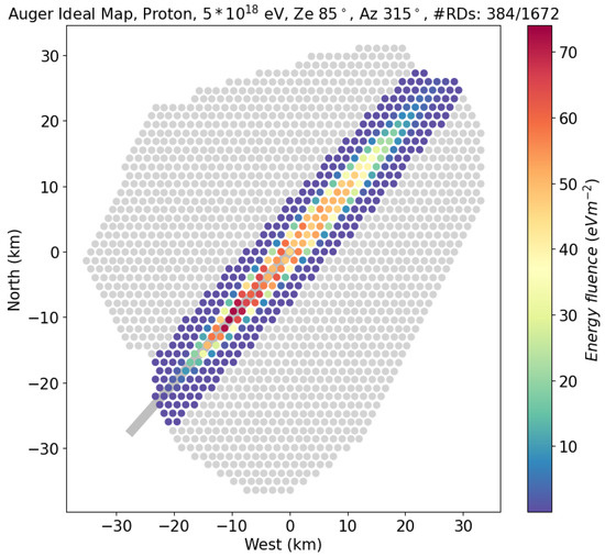 The energy fluence for an ideal Auger map simulation for a proton UHECR with an energy of eV, a zenith of 85°, and an azimuth of 315° (an EAS coming from the south-east). The radio antennas that were not simulated are depicted in light gray. The shower axis is depicted in gray.