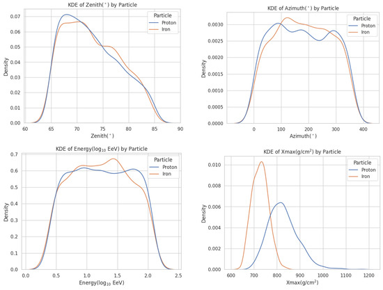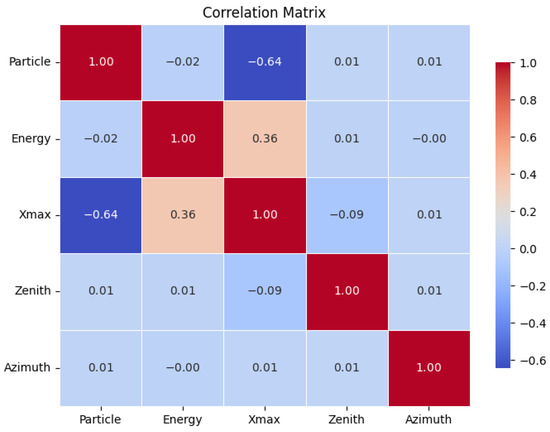 The Pearson correlation coefficient (PCC) also highlighted the importance of in determining the nuclear composition of the UHECRs (Figure 10). While the other observables had a low impact, due to their uniform distribution for both primaries, there was a stronger linear correlation (−0.64) between and the primary particle type (proton encoded as 0, and iron as 1): proton-induced showers reached their maximum at a greater depth in the atmosphere, compared to those induced by iron. Additionally, a significant linear correlation (0.36) existed between and energy: air showers induced by cosmic rays with higher energies reached their maximum at greater depths in the atmosphere.