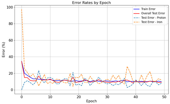 At each epoch, we plotted the training and test errors, the loss curve, and the MCC, and Accuracy scores, for a total of 50 epochs. The test errors (Equation (5)) for both proton and iron (Figure 12) followed a similar decreasing trend, stabilizing around 10%. This demonstrates the robust ability of the model to predict the nuclear composition of the UHECR based on only observable and radio images.