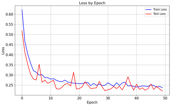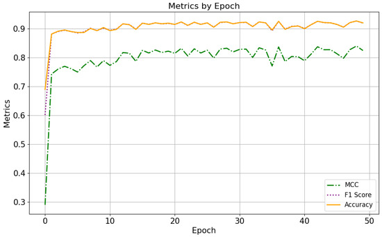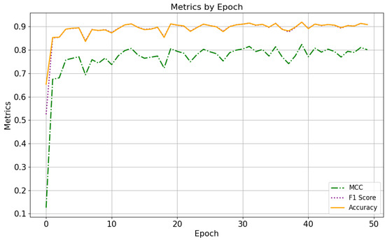 Regarding the evaluation metrics (Figure 14), the MCC increased rapidly in the first few epochs and then gradually stabilized around 0.8. This indicated a strong correlation between predicted and actual values. Accuracy increased quickly and then stabilized around 0.9, suggesting good performance on the classification task. The lower MCC value compared to Accuracy may indicate that the class imbalance affected the predictions. The score increased sharply at the beginning and stabilized around 0.9, indicating a good balance between precision and recall.
