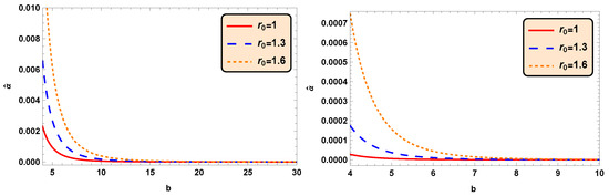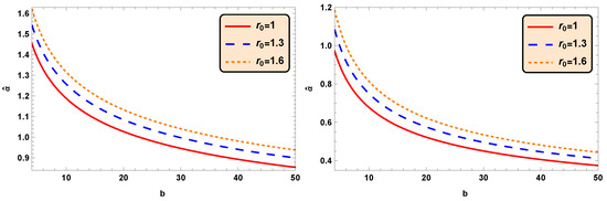 This deflection angle is graphically depicted in Figure 1 (Left), which ensures that it decreases in increasing values of impact parameter b and increases for increasing values of wormhole throat radius . Furthermore, one can see that the deflection angle becomes zero for , the absence of Einstein–Cartan wormholes.